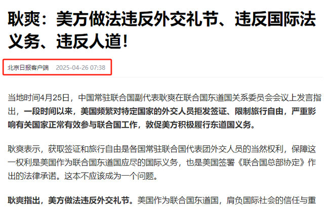 4月25日,耿爽在联合国东道国关系委员会会议上表示,获取签证和旅行自由是各国常驻联合国代表团外交人员的当然权利。